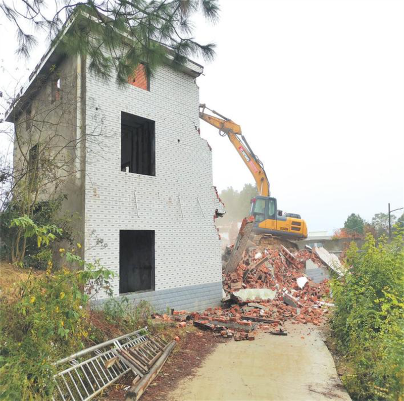 “轰隆隆……”上午9时,离三荷机场不到1公里的空港新村彭家组附近,一台挖机进场,70平方米的违章建筑被拆除。拆除作业先从屋顶开始,很快,一块块碎石落下,激起尘土飞扬。在挖机的拆除下,违法建设很快就只剩下了零星支架,直到最后一声巨响,整个建筑物轰然倒塌。整个过程不过10分钟。