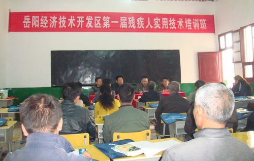 2013年10月29日上午9时,随着市残联李正望副理事长为岳阳经济技术开发区残疾人果树苗木栽培实用技术培训基地揭牌,经开区第一届残疾人实用技术培训班正式开班,首期15名残疾人将接受为期5天的果树苗木栽培实用技术培训。