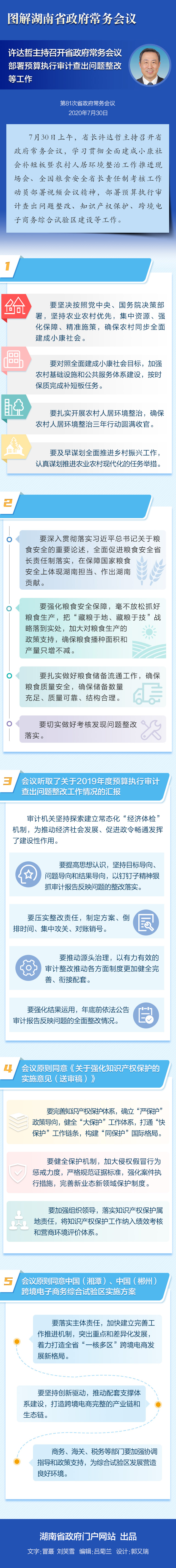 7月30日上午,省长许达哲主持召开省政府常务会议,学习贯彻全面建成小康社会补短板暨农村人居环境整治工作推进现场会、全国粮食安全省长责任制考核工作动员部署视频会议精神,部署预算执行审计查出问题整改、知识产权保护、跨境电子商务综合试验区建设等工作。