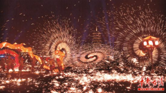 长沙铜官窑古镇上演非遗技艺“打铁花”,漫天铁花如流星雨。(记者 郭立亮 摄)