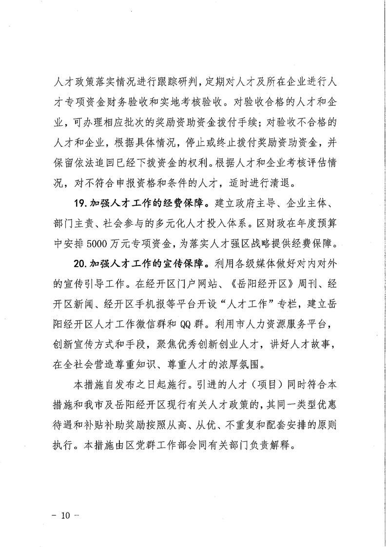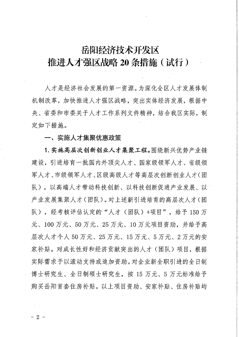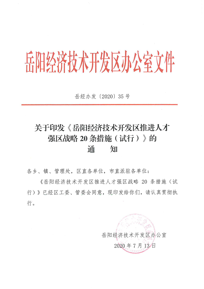 关于印发《岳阳经济技术开发区推进人才强区战略20条措施(试行)》的通知(岳经办发[2020]35号)