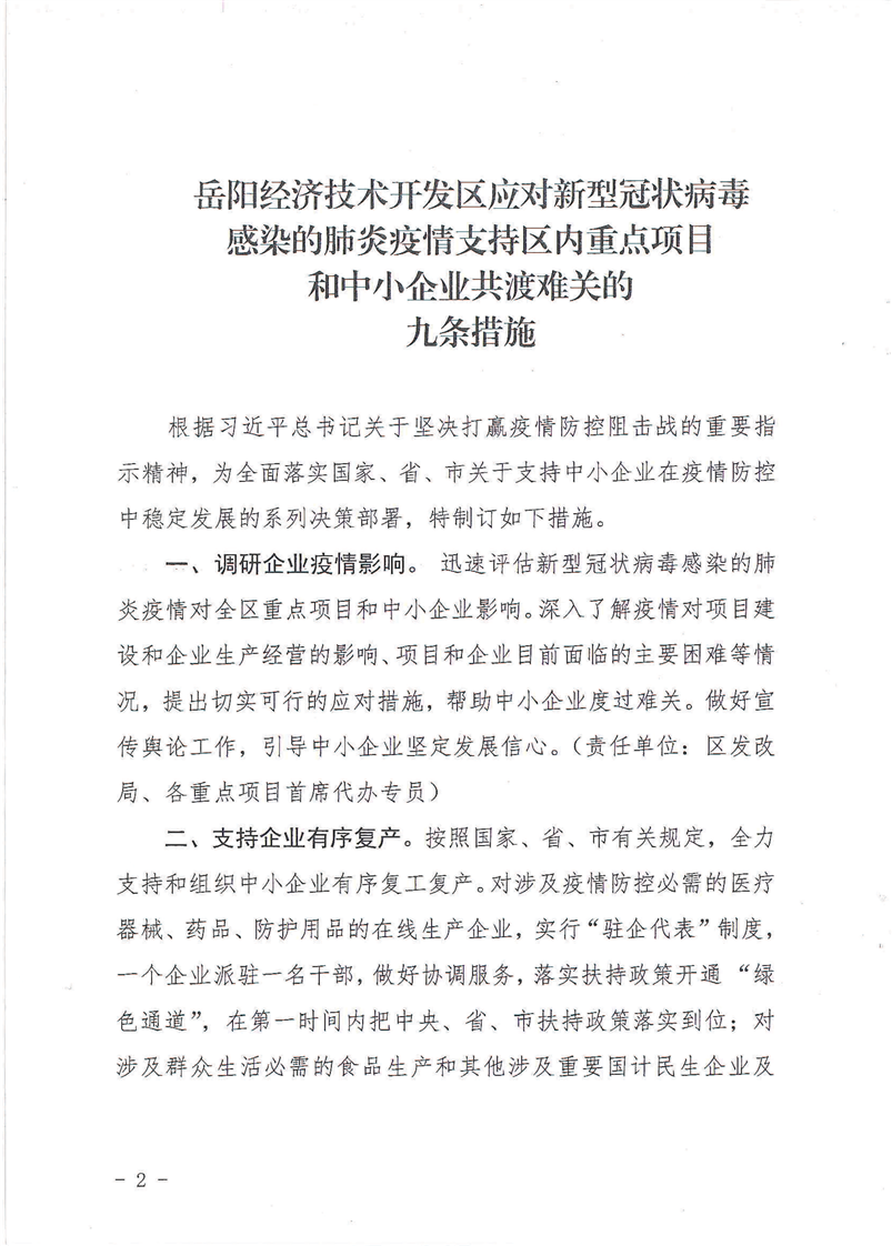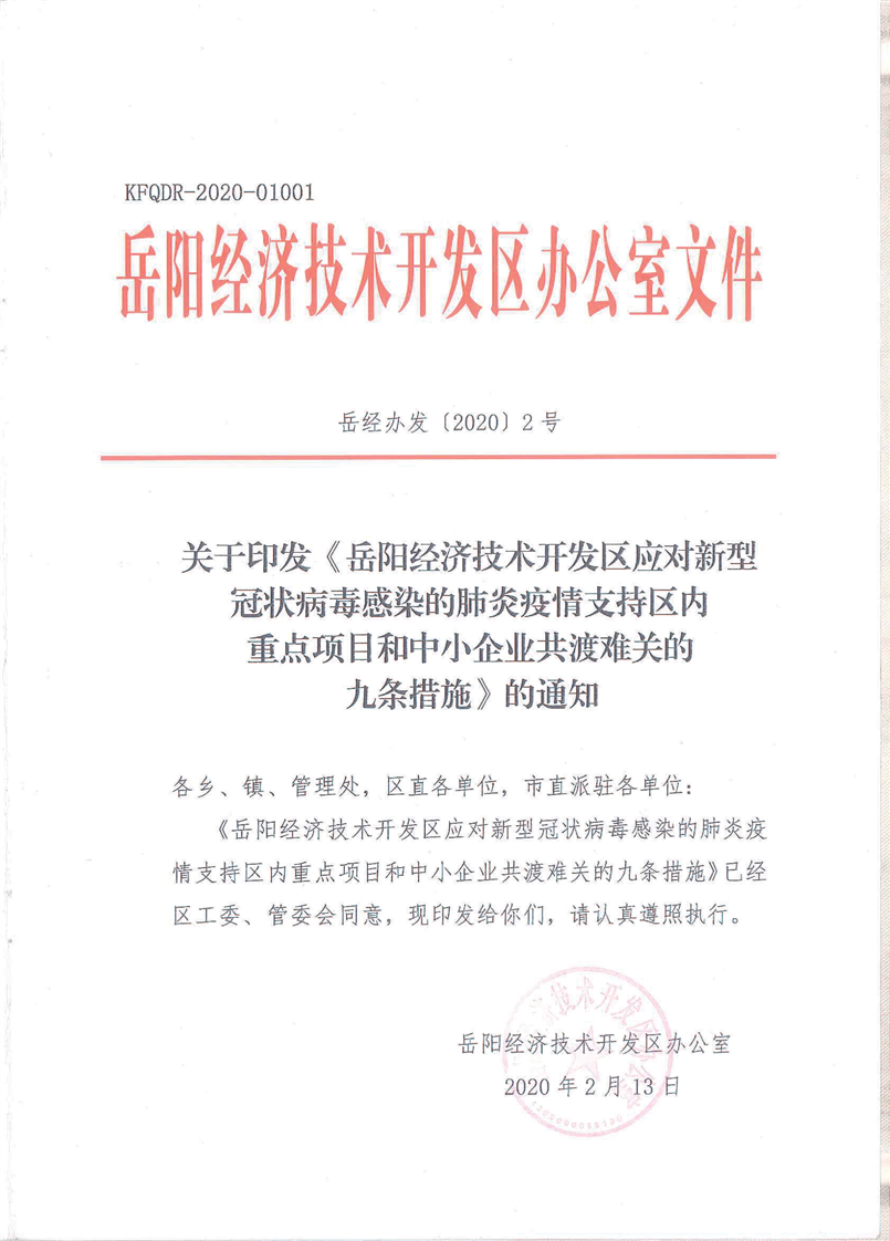 关于印发《岳阳经济技术开发区应对新型冠状病毒感染的肺炎疫情支持区内重点项目和中小企业共渡难关的九条措施》的通知