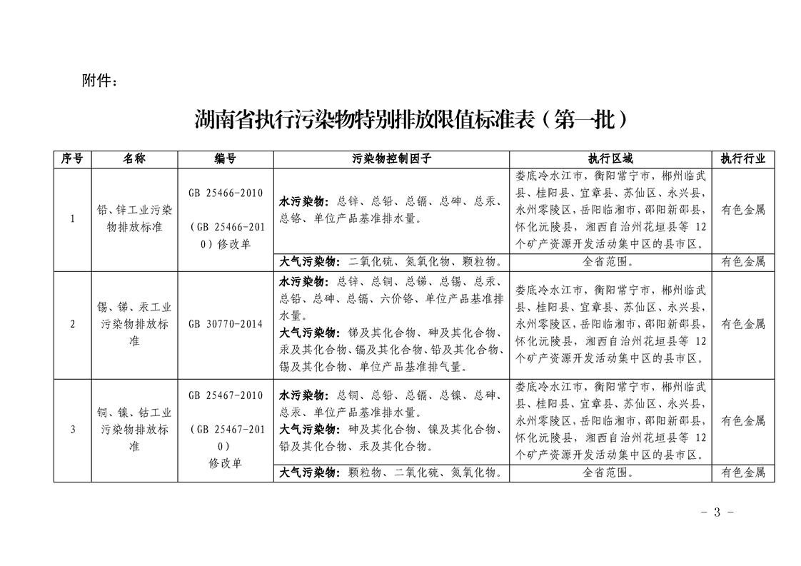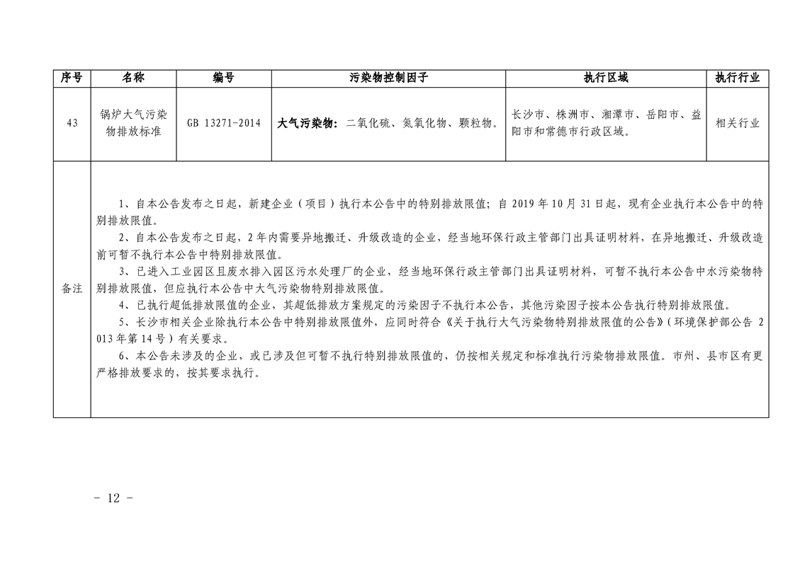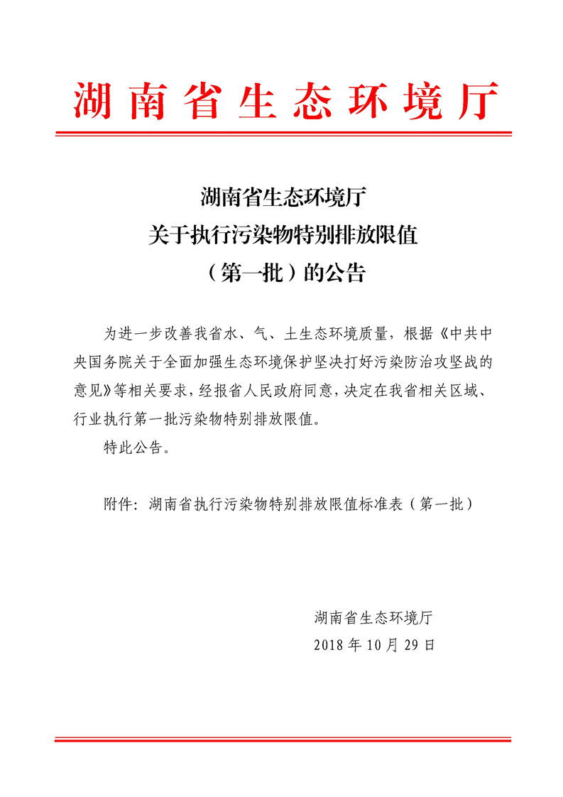 湖南省生态环境厅关于执行污染物特别排放限值(第一批)的公告