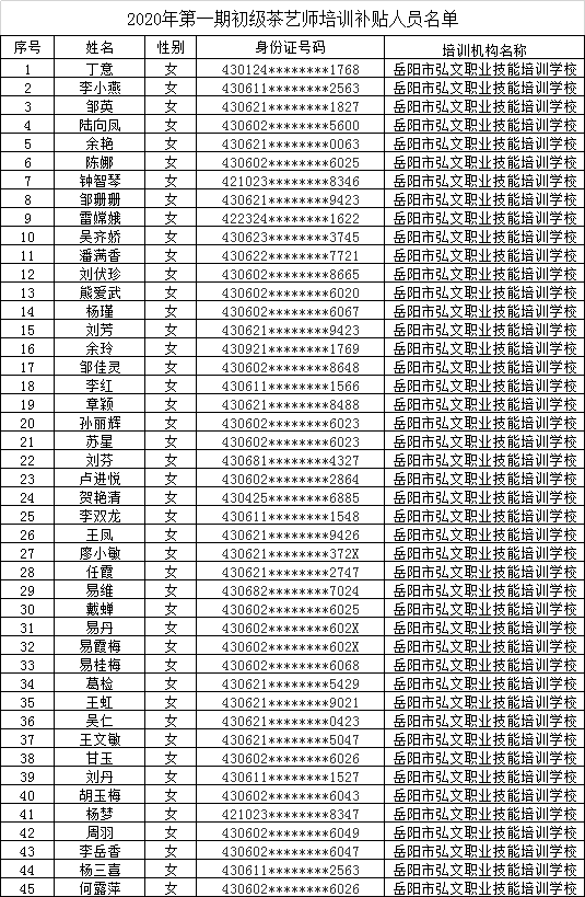 岳阳经开区2020年第一期初级茶艺师培训补贴人员名单