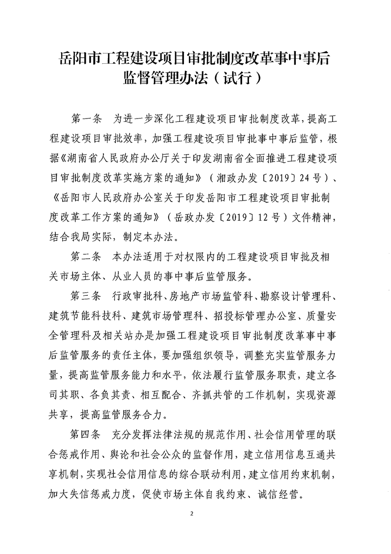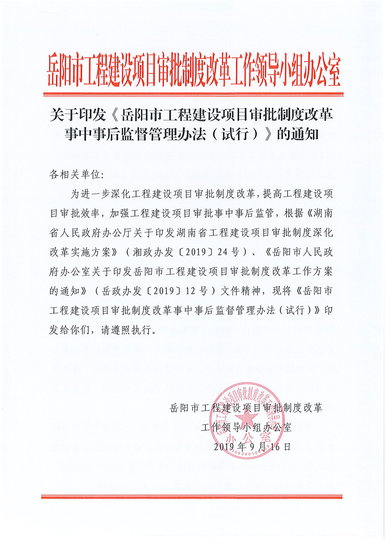 关于印发《岳阳市工程建设项目审批制度改革事中事后监督管理办法(试行)》的通知