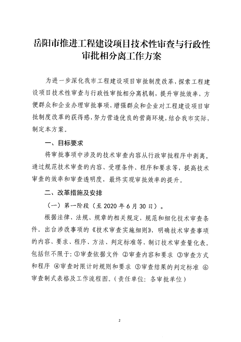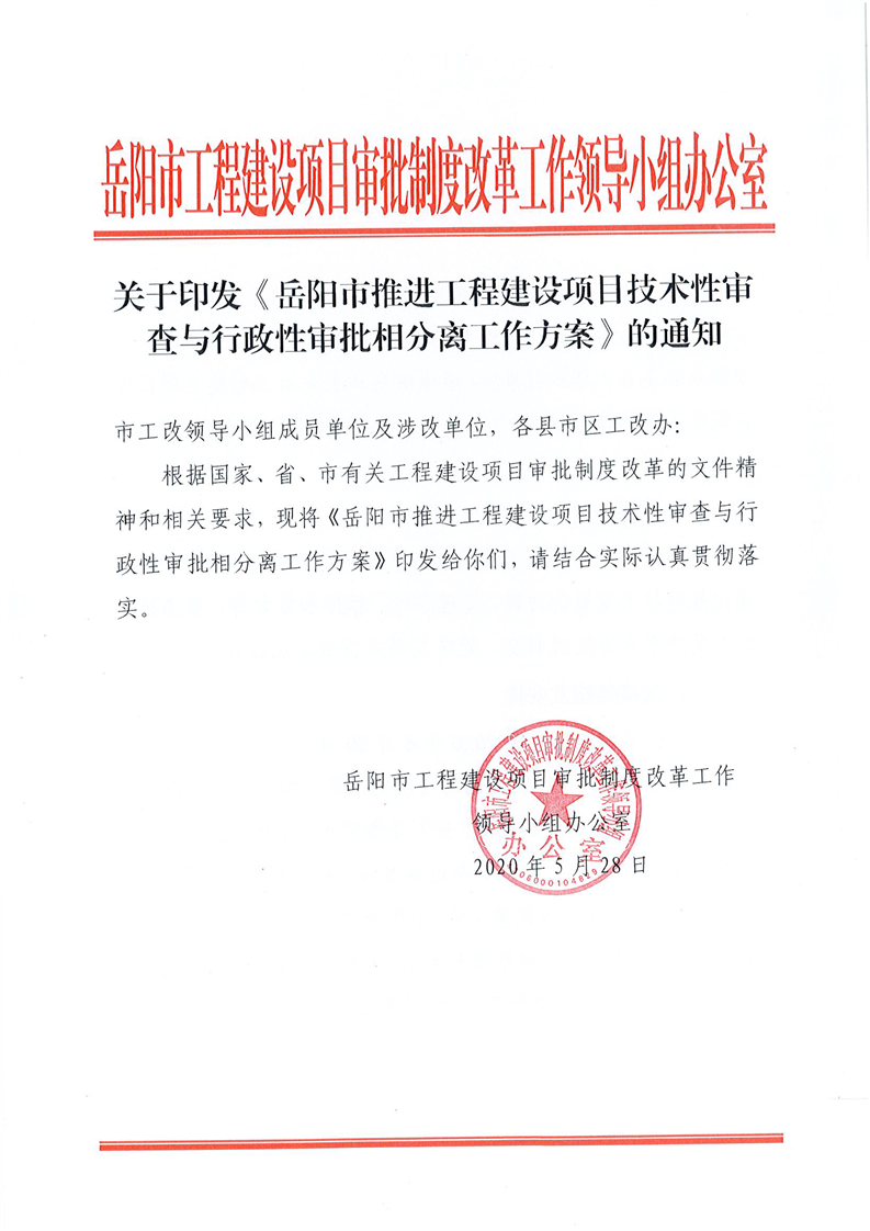 关于印发《岳阳市推进工程建设项目技术性审查与行政性审批相分离工作方案》的通知