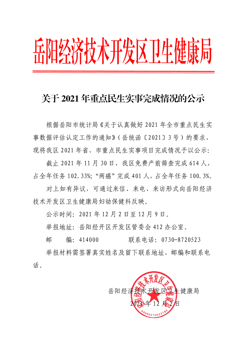 岳阳经开区卫生健康局关于2021年度重点民生实事完成情况的公示