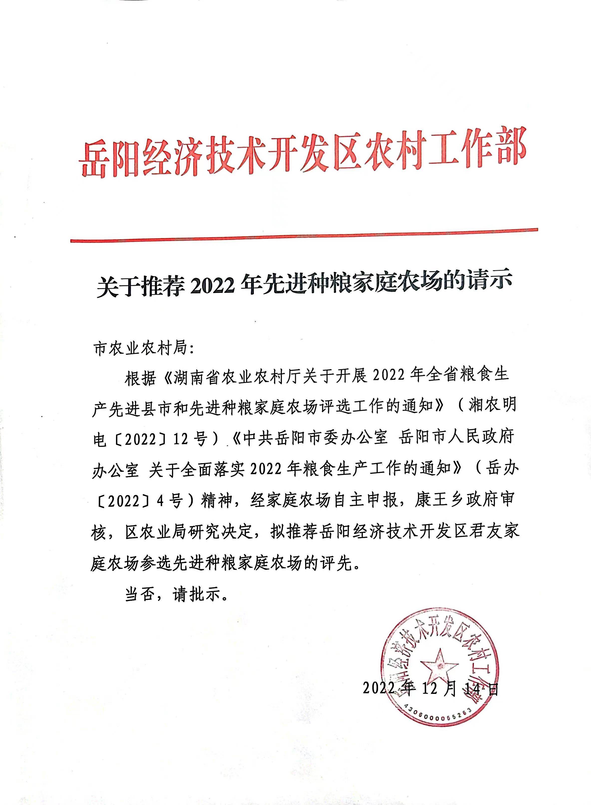 关于推荐2022年先进种粮家庭农场的公示
