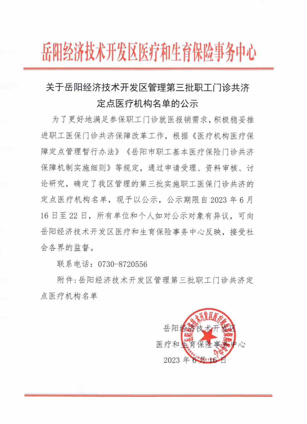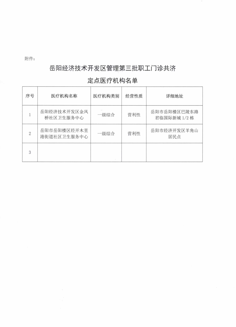 关于岳阳经济技术开发区管理第三批职工门诊共济定点医疗机构名单的工公示