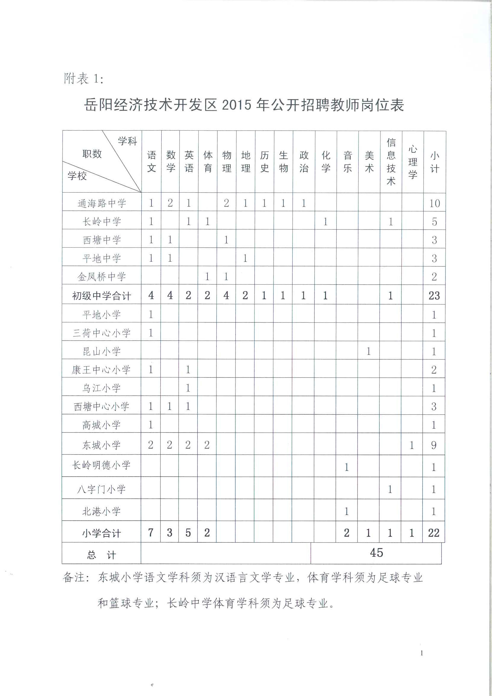 1.《岳阳经济技术开发区2015年公开招聘教师岗位表》