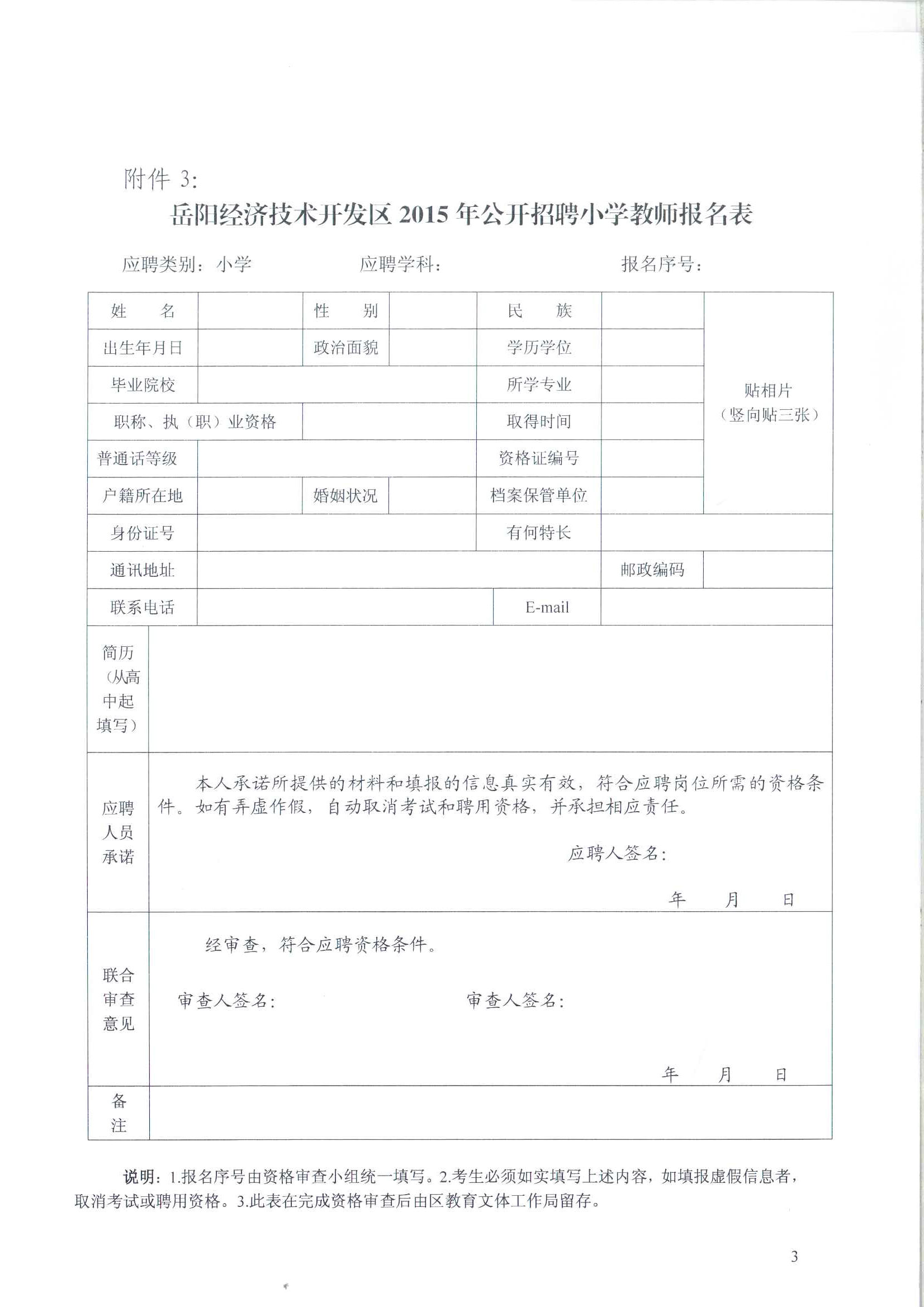 3.《岳阳经济技术开发区2015年公开招聘小学教师报名表》