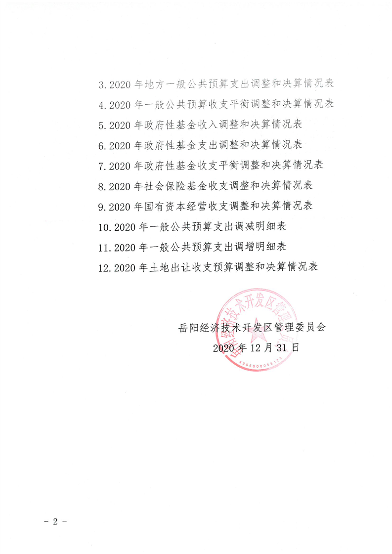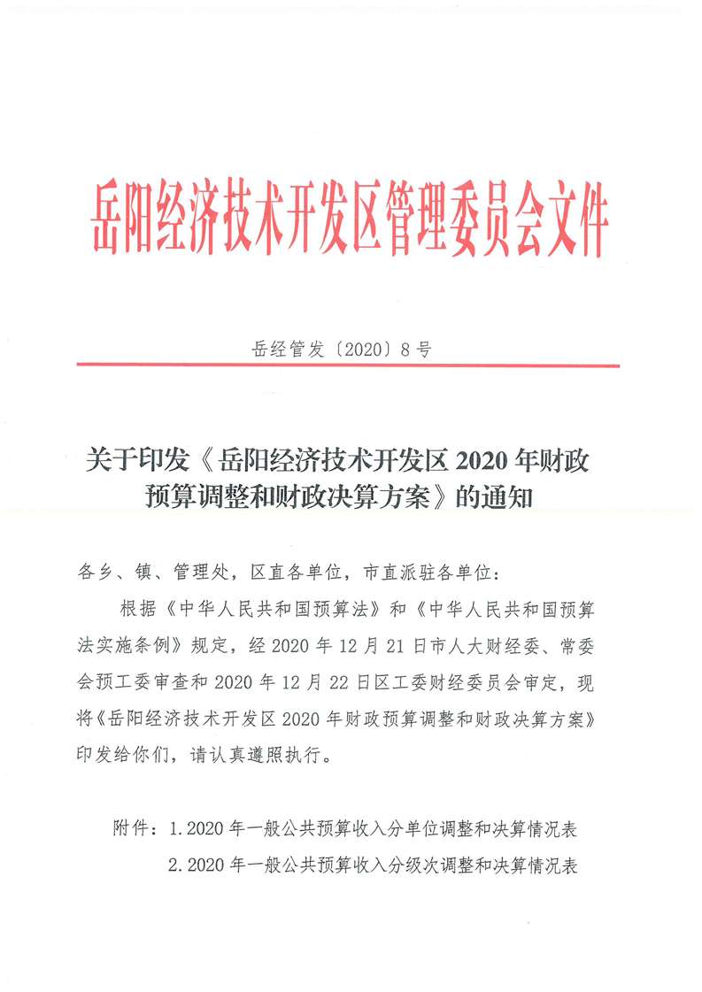 关于印发《岳阳经济技术开发区2020年财政预算调整和财政决算方案》的通知
