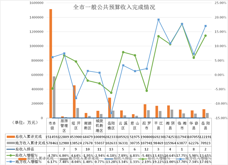 从全市收入完成情况看,一般公共预算收入增长4.64%,高于全市平均增幅4.84个百分点,税收占比达到87.2%,比上年增加4.6个百分点,在总量稳步增长、高居榜首的同时,收入质量越来越优。地方公共财政预算收入共完成收入138524万元,减少12117万元,主要原因为非税收入同比减少17347万元;地方税收收入完成较好,共完成80441万元,同比增加5230万元,增长6.95%,占比达到58.07%,比上年增加8.14个百分点。