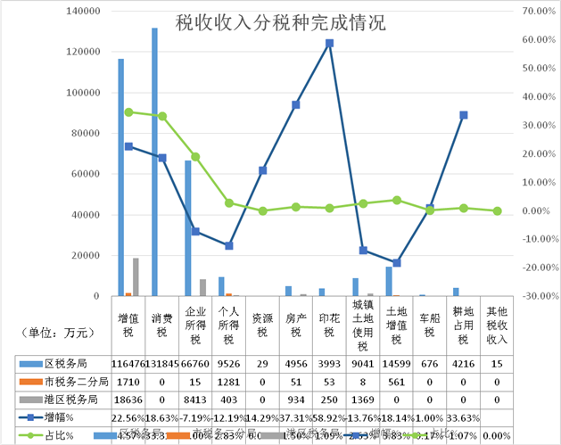 分税种情况:收入税种呈现出“七增四减”的特点,主体税种增值税完成较好,是税收增长的主要动力,共完成136823万元,同比增加25182万元,增长22.56%;消费税持续高增长态势,共完成131845万元,增长18.63%;受减税降费及各项普惠政策全面落实的影响,企业所得税下降较多,共完成75189万元,同比减少5826万元,下降7.19%;个人所得税共完成11209万元,同比减少1556万元,下降12.19%;城镇土地使用税和土地增值税首现负增长,分别下降13.76%和18.14%,严重影响我区地方税收收入增幅。