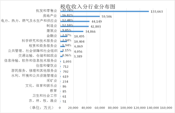 分行业情况:2019年我区企业全口径税收(含城市维护建设税、教育费附加等)409640.79万元,其中工业税收87185.02万元,含水电热气生产和供应业44148.59万元、制造业42802.73万元、采矿业233.7万元;房地产业59506.21万元,建筑业税收34865.93万元;批发和零售业133663.48万元。