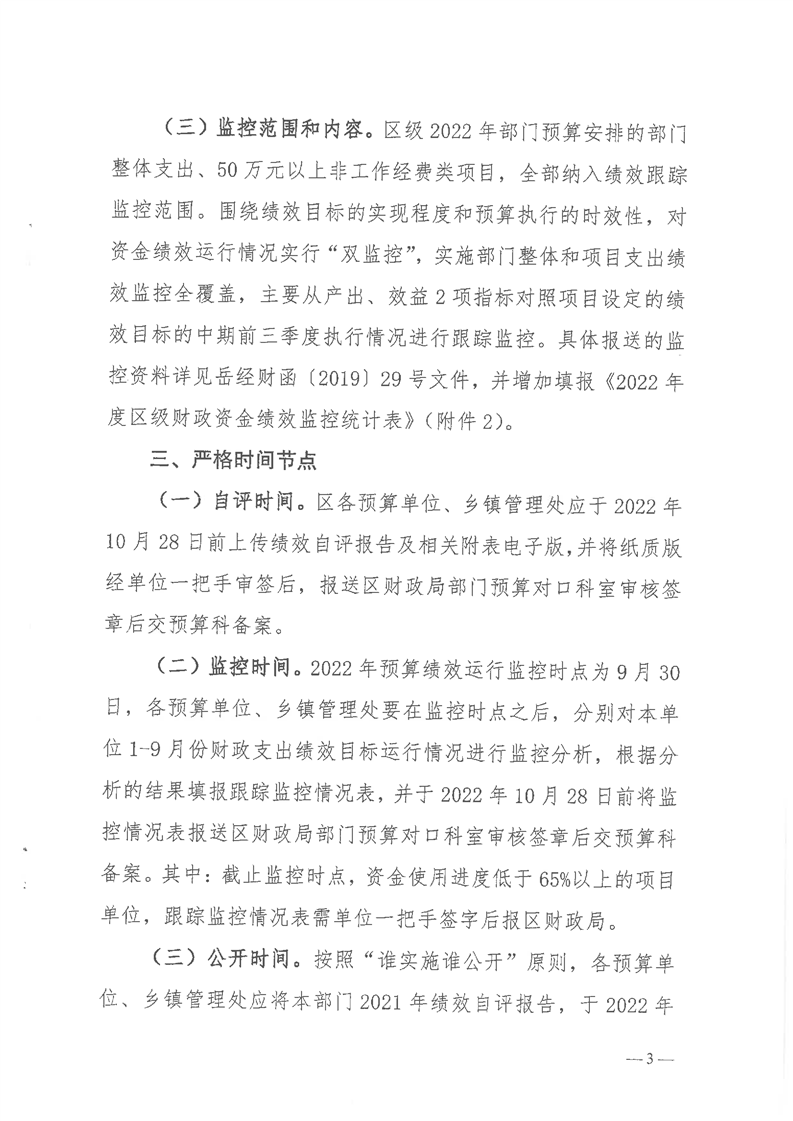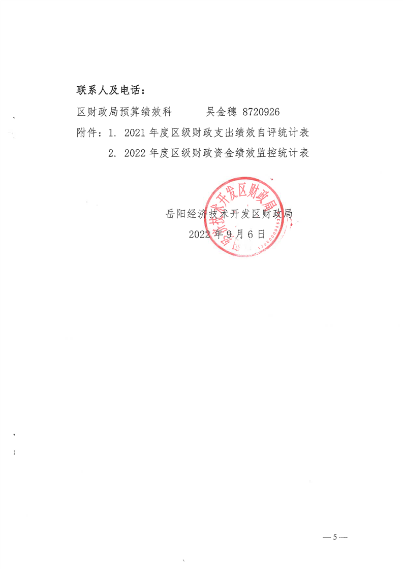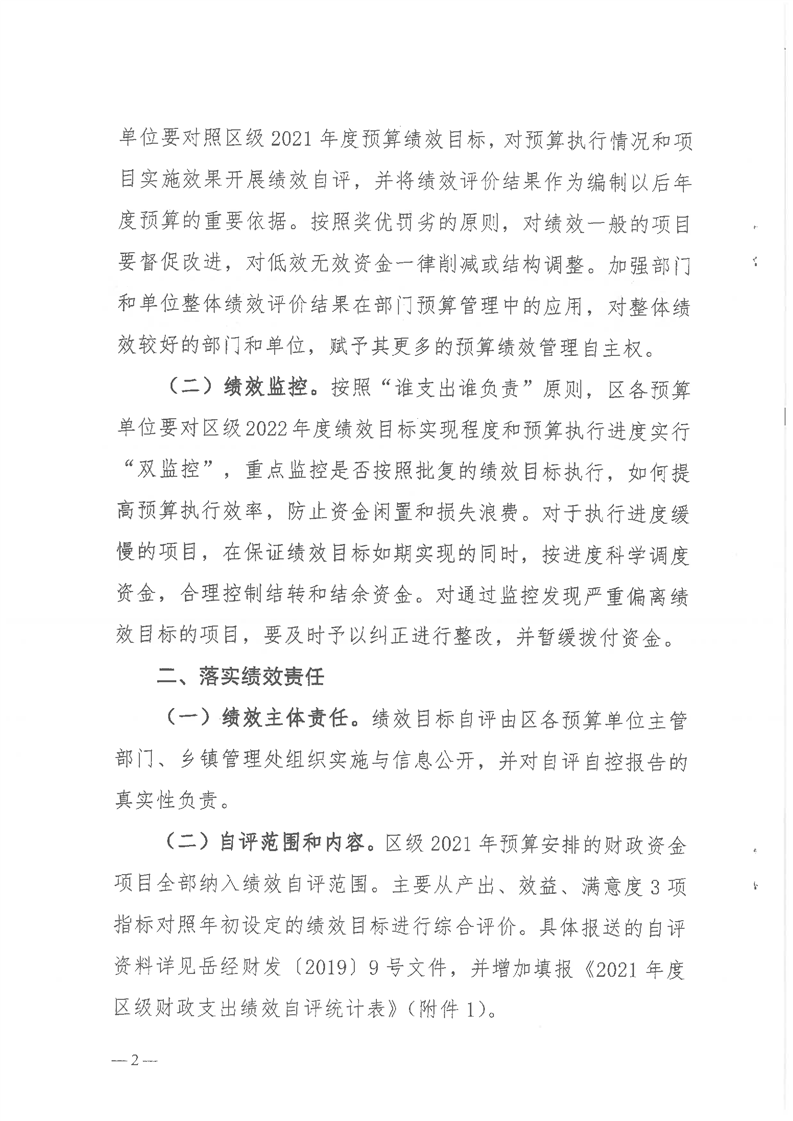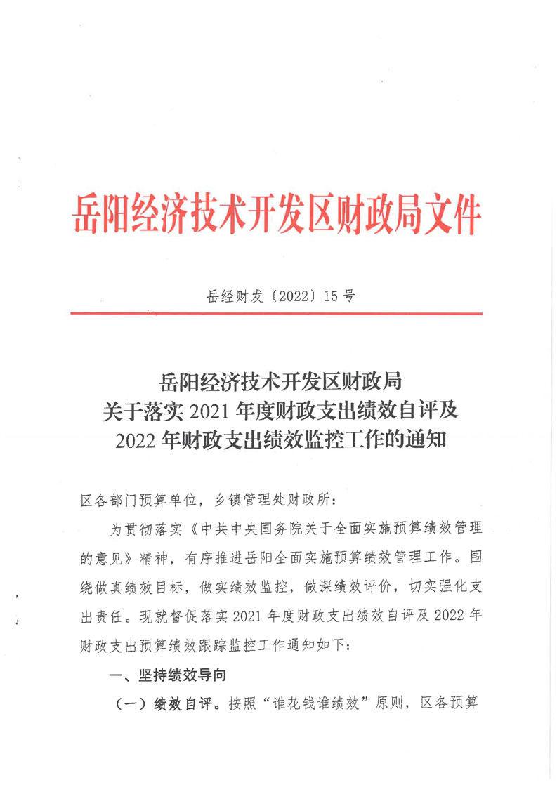 岳阳经济技术开发区财政局关于落实2021年度财政支出绩效自评及2022年财政支出绩效监控工作通知