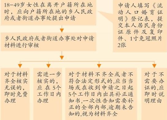 2.审核和发放。办证机关对申请材料进行审核。对材料齐全、经核实无误的,应当即时免费办理《流动人口婚育证明》;需要进一步核实的,在5个工作日内核实办理;对材料不齐全或者不符合法定形式的,应当当场或在收到申请之日起5个工作日内出具补正通知书,一次性告知需要补正的全部内容,逾期未告知的,视为材料齐全;对不需要办证的,应当即时说明不需办理《流动人口婚育证明》的理由。