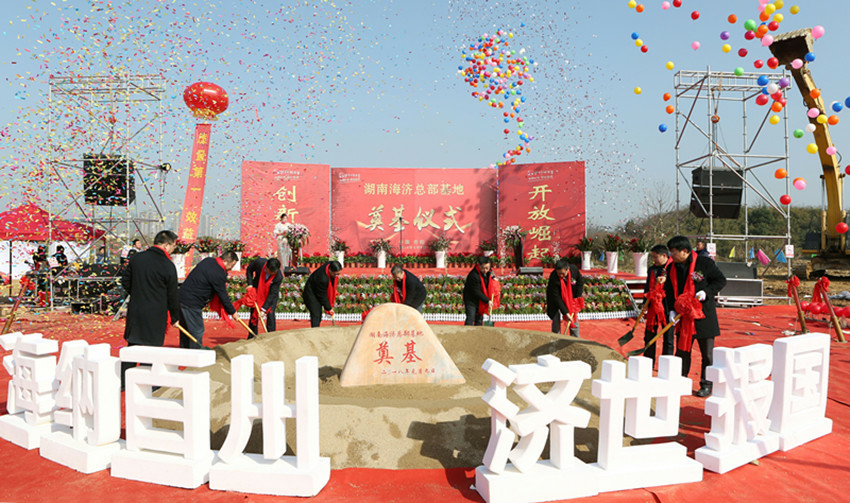 1月9日,湖南海济总部基地项目举行奠基仪式。岳阳市委常委、常务副市长唐道明出席并宣布项目开工,岳阳经开区工委书记文春方致辞,区工委副书记、管委会主任谢春生,湖南海济集团董事长刘长春,岳阳经开区领导严若鹏、许淞、谭国良、何厚德及各部门单位主要负责人参加。该项目是岳阳经开区2018年开工建设的第一个重大项目,这也标志着我区吹响了“产业项目建设年”的进军号角。