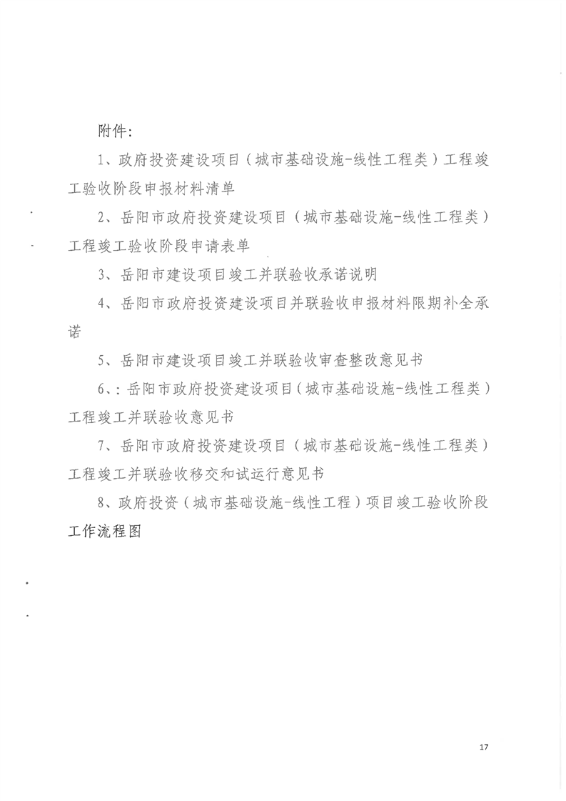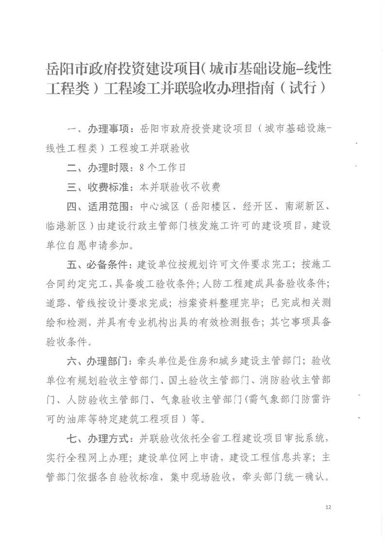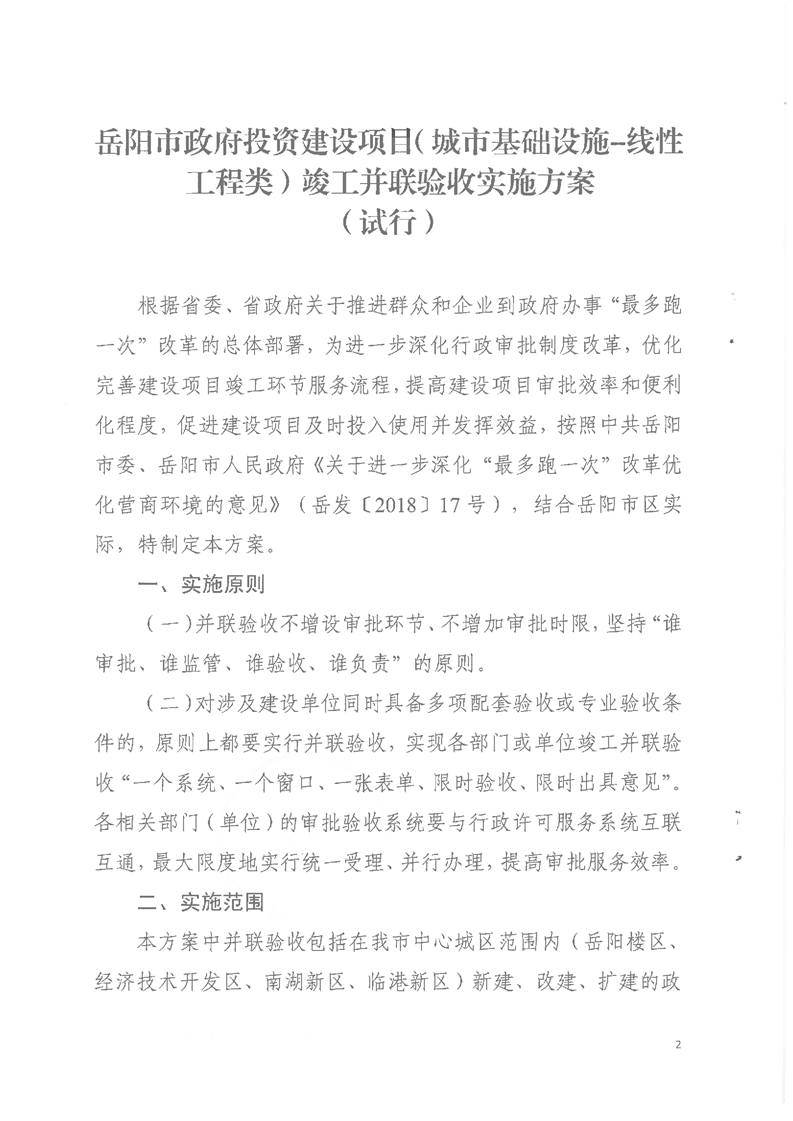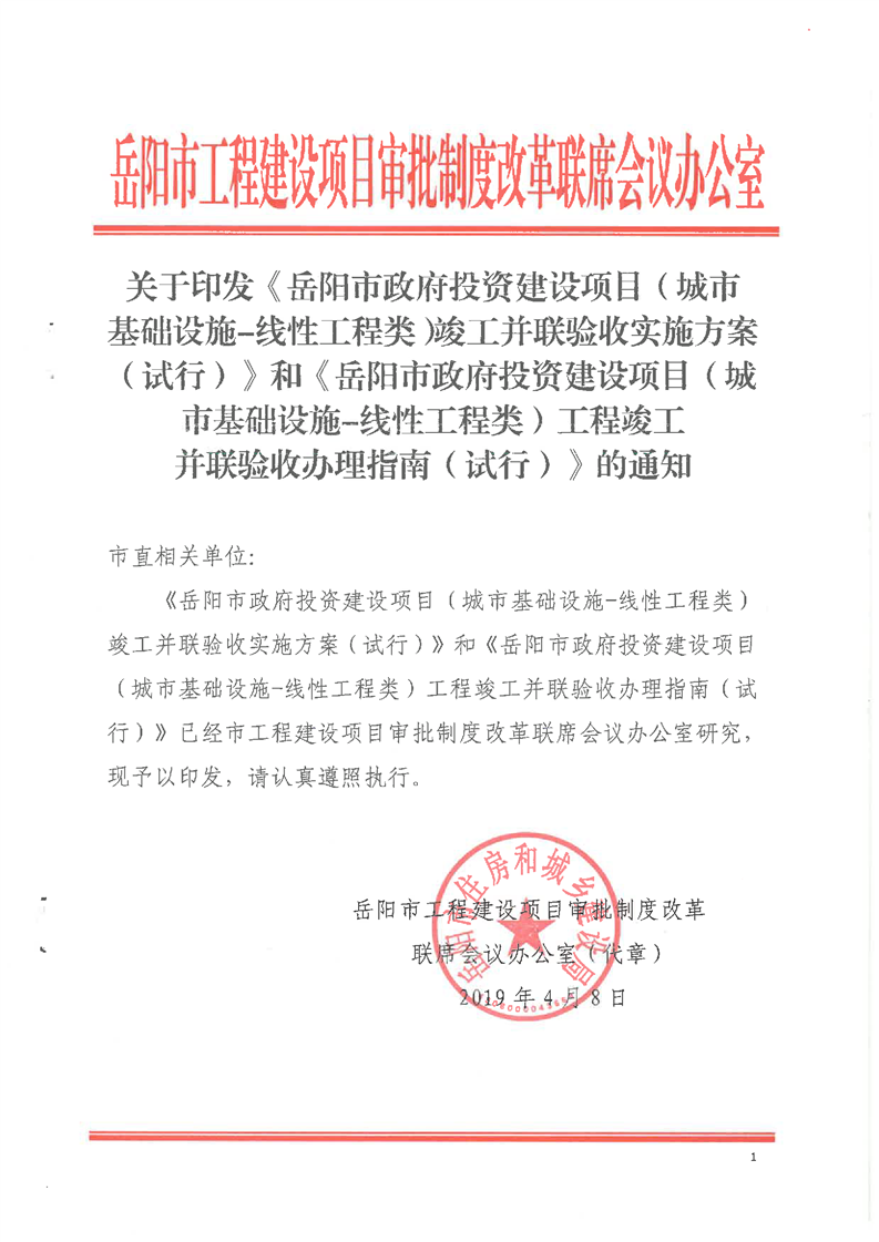 关于印发《岳阳市政府投资建设项目(城市基础设施一线性工程类)竣工并联验收实施方案(试行)》和《岳阳市政府投资建设项目(城市基础设施一线性工程类)工程竣工并联验收办理指南(试行)的通知