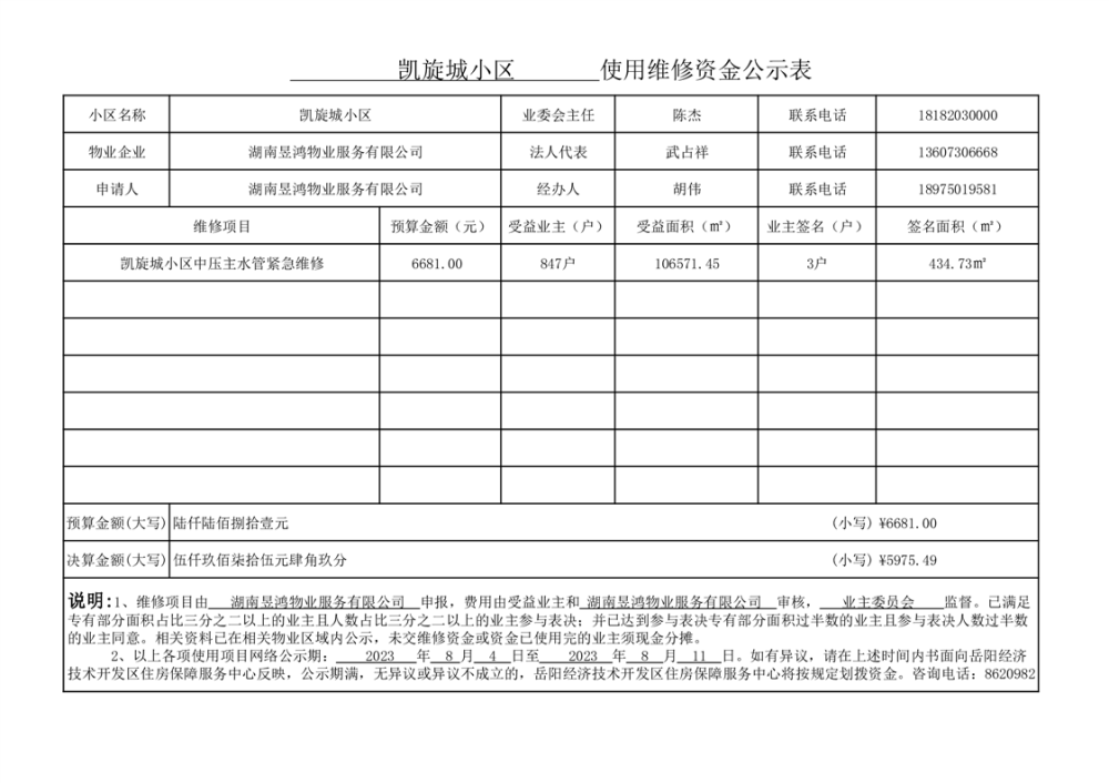 凯旋城小区主水管爆裂紧急维修资金网上公示表