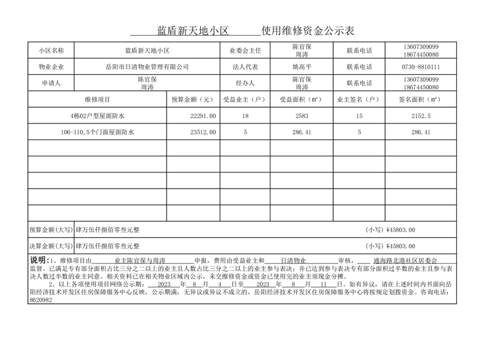 蓝盾新天地小区维修资金网上公示表