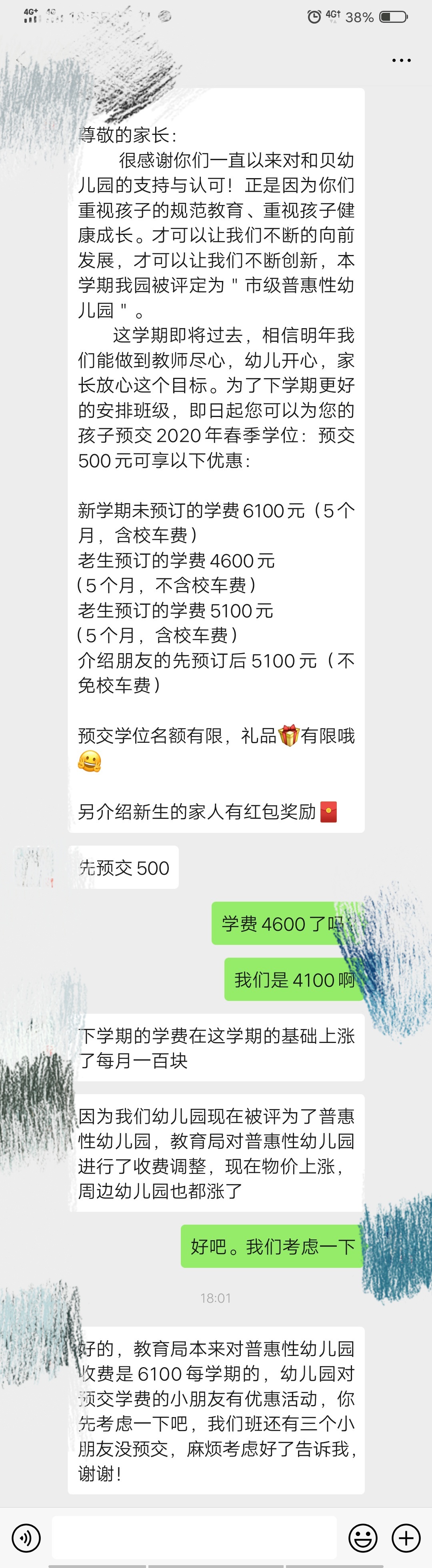 您好,我的小孩今年9月份就读于岳阳市八字门黎家垅路6号白象食品对面(和贝情境幼儿园),今年9月份入园时学费4100元/学期(不包含车费)一学期为5个月。本月接到老师通知预交下学期学费,4600元/学期(不包含车费),就学费上涨500元/学期,和幼儿园老师以及幼儿园负责人沟通,幼儿园给出回复,该幼儿园被评为普惠性幼儿园,教育局本来对普惠性幼儿园收费是6100每学期。疑问:普惠性幼儿园不是应该更加优惠吗?为何学费还会涨?在教育局公布的2018年至2020年普惠性幼儿园评比里面也没有看到和贝情境幼儿园。请问这样的涨价合理吗?不合理该怎么制止? |