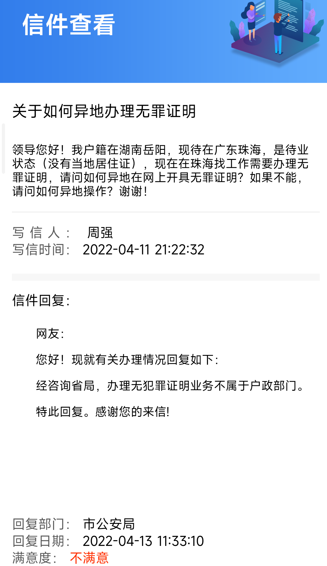 | 内容: | 市长您好!非常抱歉要麻烦到您,给您来信!事情发展是这样的:我的户籍在湖南岳阳,现待在广东珠海,是待业状态(没有当地居住证),现在在珠海找工作需要办理无罪证明,前两天在网上写信求助,但是市领导的回复似乎无法解决人民群众的烦恼,既然这事不归该部门管理,那么是否应该回信时附上正确的处理方法呢?而不是让人民群众两头跑、到处问。希望我们政府能够积极落实首问责任制、不断完善一网通办,让群众少跑腿、让信息多跑路,民生无小事,枝叶总关情。最后我衷心的表示:我爱岳阳,希望我们岳阳人民生活越来越幸福,感谢市长!感谢政府!感谢中国共产党! |